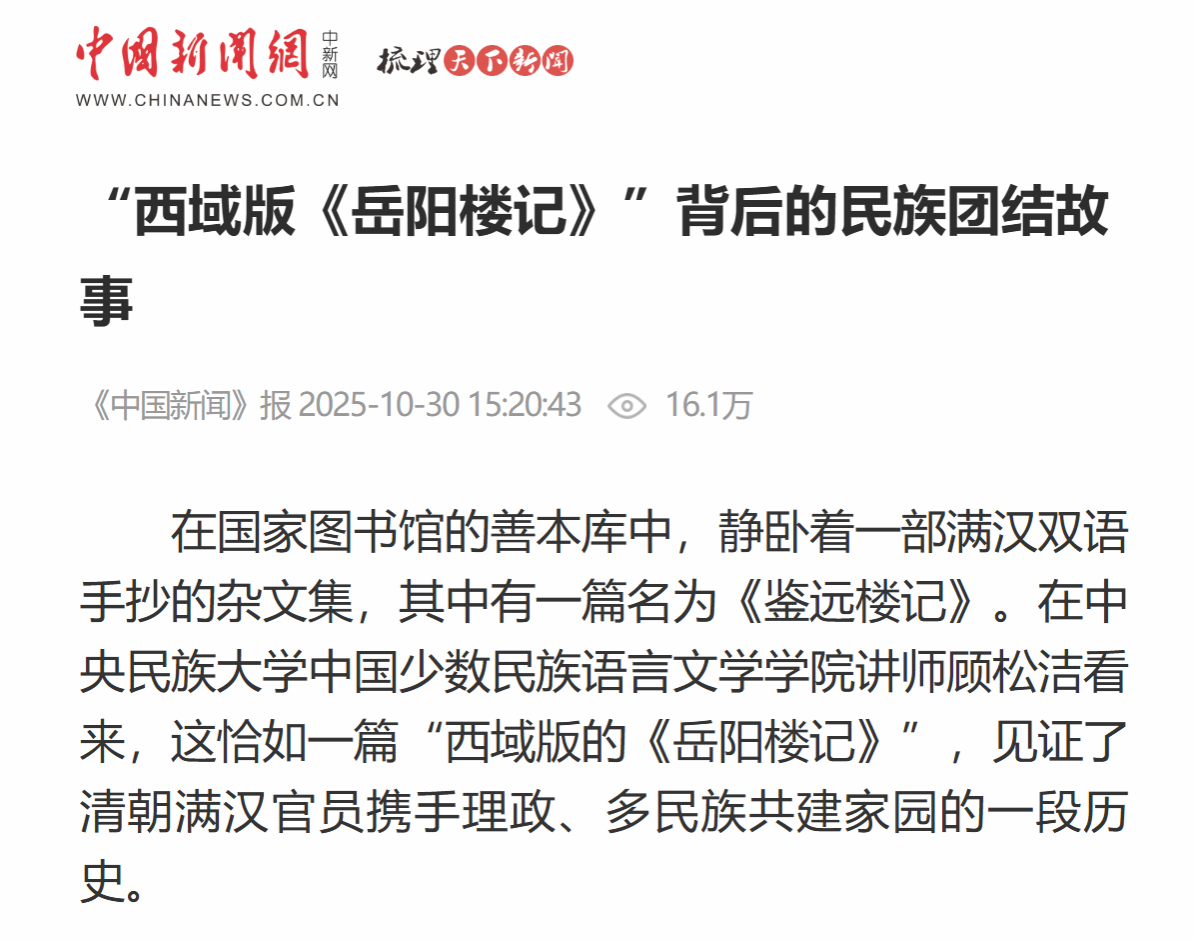 (全文转自中国新闻网平台,请浏览全文请点击右侧链接“西域版《岳阳楼记》”背后的民族团结故事)