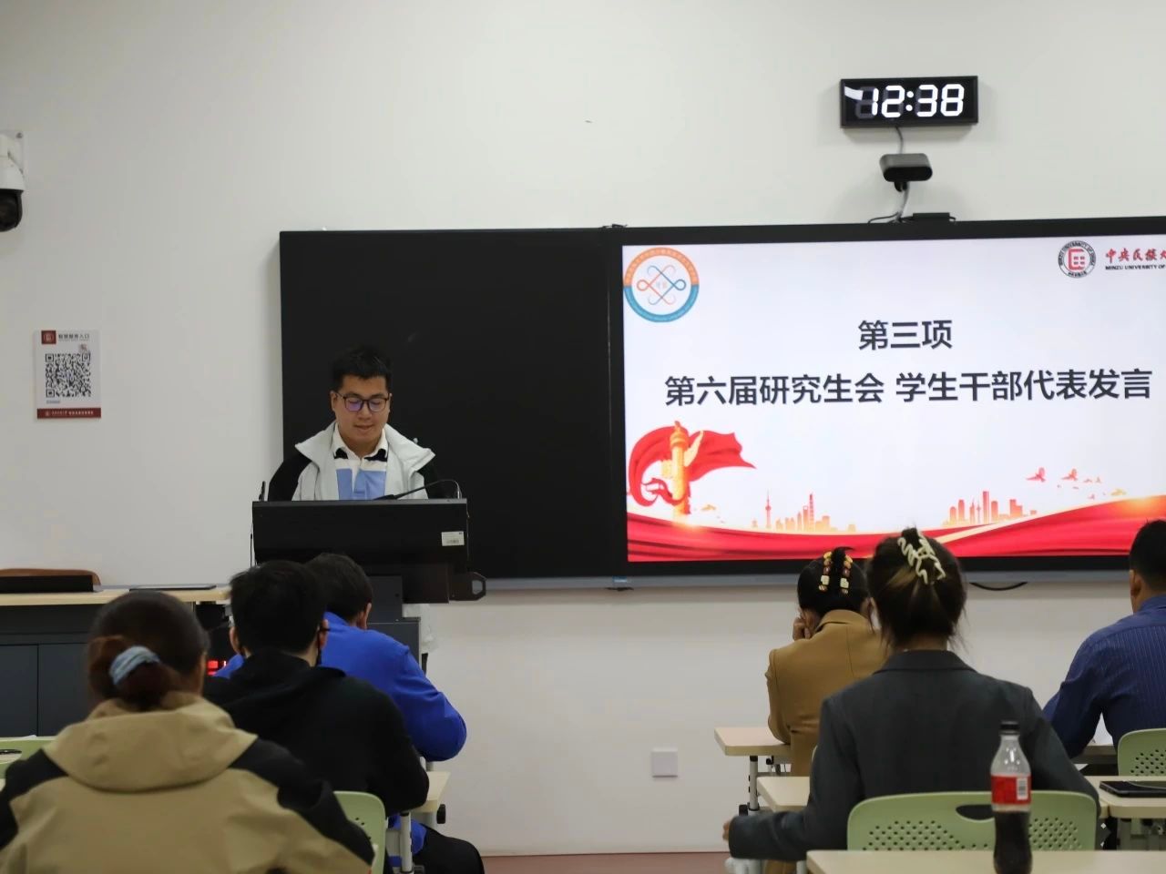 会议第三项,第六届研究生会学生干部代表陈遵鹏和毕琼分别发言。两位学生干部代表介绍了本部门工作计划,同时也表示将积极配合其他部门,定期进行交流,听取意见与建议,提升个人工作能力,优化工作流程,确保各项工作顺利开展。